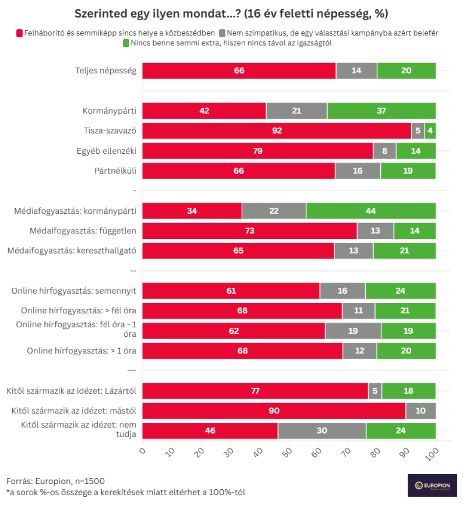 Kevésbé egyértelmű a közvélemény álláspontja az ügy helyes lezárását illetően. A magyarok valamivel több mint fele (52 százalék) szerint nem elég a bocsánatkérés, és Lázárnak le kellene mondania, míg 36 százalék szerint a bocsánatkéréssel lezárult az ügy (a maradék 11 százalék szerint bocsánatkérésre sem lett volna szükség). A demográfiai csoportokat vizsgálva a fővárosiak és a diplomások szigorúbbak az átlagnál (63 százalék, illetve 64 százalék szerint Lázárnak le kellene mondania), a politikai táborokat összehasonlítva pedig a fenti minta köszön vissza. A Tisza-szavazók véleménye nagyjából konszenzusos (89 százalék szerint Lázárnak le kellene mondania), míg a kormánypártiak inkább kritikusak, de elnézőek (64 százalék szerint a bocsánatkéréssel lezárult az ügy). Ezzel együtt minden ötödik kormánypárti szerint Lázárnak le kellene mondania.